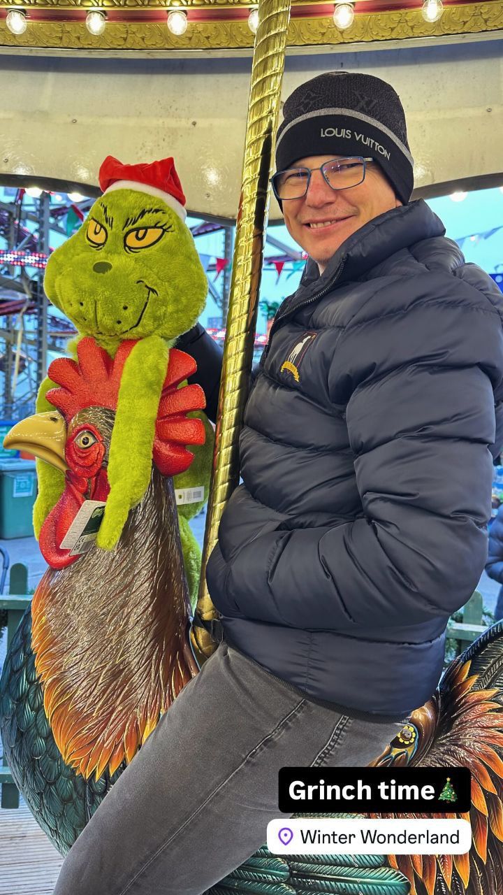 Экс-футболист сидит на фигуре петуха на карусели и держит в руке Гринча, который является одним из символов Рождества и Нового года. Аршавин сейчас находится в Лондоне.